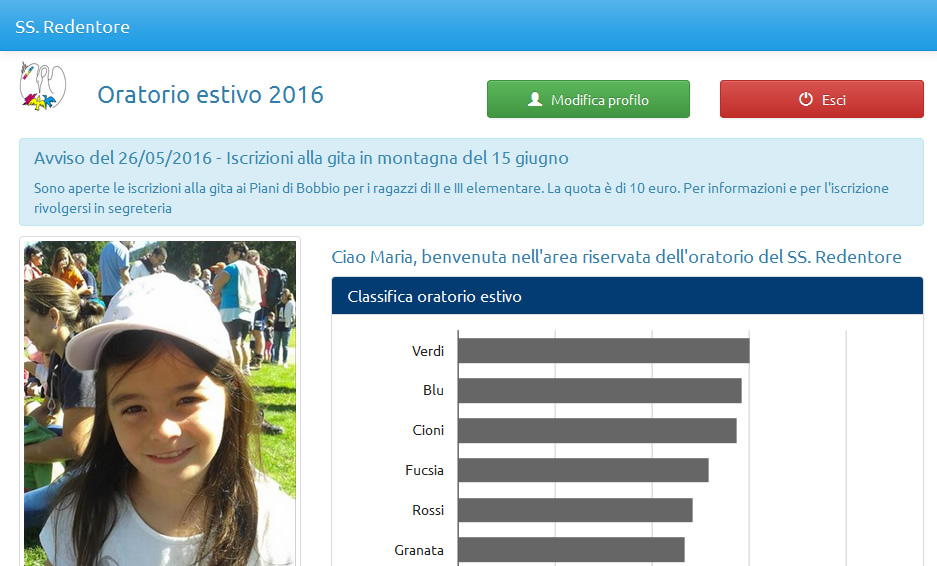Ciascun iscritto all'oratorio ha una scheda dedicata con all'interno numerose informazioni facilmente consultabili: